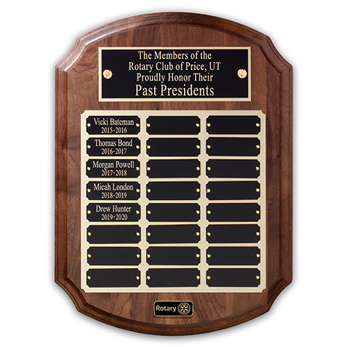 A universal club favorite. Genuine walnut multi-recognition plaque ideal for recognizing Paul Harris Fellows, Past Officers, Rotarians of the Year, Youth Exchange Students and other continuity awards. 11" x 15"